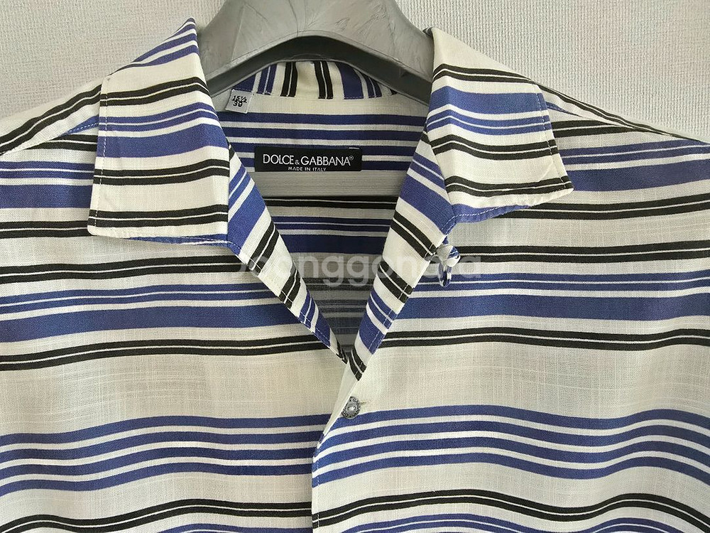돌체인 가바나 정품 스트라이프 셔츠입니다. 깔끔한 화이트 베이스에 블루와 네이비 스트라이프 패턴이 세련된 제품이에요. 상태 양호하고 고급스러운 디자인으로 다양한 스타일링이 가능합니다.