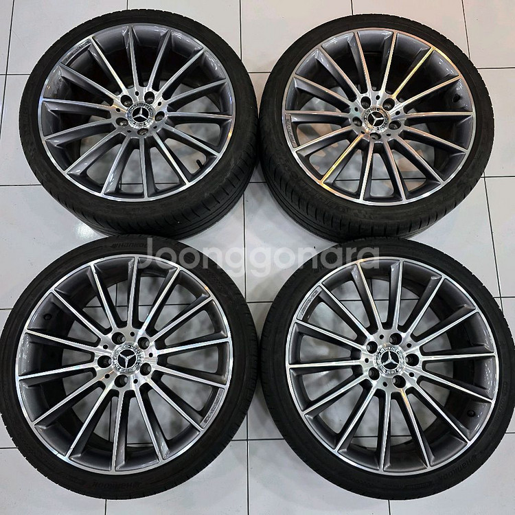 벤츠 W213 E클래스 AMG 마차 휠 20인치 정품 중고휠입니다. 앞 휠 1개는 기스 살짝, 크랙이 2번 나서 용접 수리한 적 있고, 나머지 1개도 기스 있습니다. 뒤 휠 1개도 기스 살짝 있습니다. 휠 제원은 앞 8.5J x 20 ET34 / 5홀 PCD 112 , 뒤 9.5J x 20 ET48 / 5홀 PCD 112 입니다. 휠캡 포함이구요. TPMS 센서는 본인 차량 꺼 옮겨 사용하시면 됩니다. 앞 타이어는 한국타이어 Ventus S1 evo Z AS (H129)이며, DOT 코드 15MLK 1M HB 2324 → 2024년 23주차 제조(약 6월 초)로 최근 생산된 제품으로 24년 6월 25일 교체했었습니다. 뒤 타이어는 순정 출고타이어 입니다. 2021년 12월 출고 차량입니다. 사이즈는 앞 245-35-20 뒤 275-30-20 입니다. 가격은 휠 타이어 모두해서 4개 1세트 대품없이 120만원 생각합니다. 사진은 실사진이구요. 보시고 궁금하신 점은 연락주세오. 거래 지역은 고양시 일산서구 주엽동 / 타지역은 택배거래합니다. 직거래 선호하고 택배비 별도, 교환 환불은 어렵습니다.