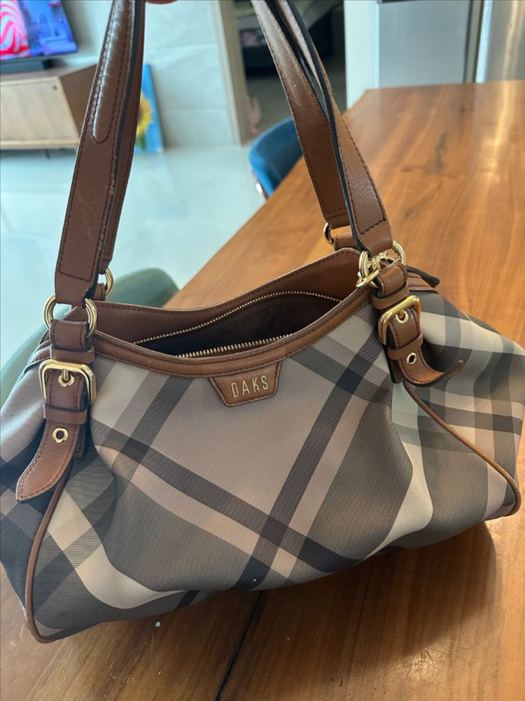시그니처 체크 패턴의 숄더백이에요. 베이지 바탕에 네이비와 브라운 체크 무늬가 클래식하고 예쁘네요. 가죽 스트랩과 골드 하드웨어로 고급스러운 느낌입니다.