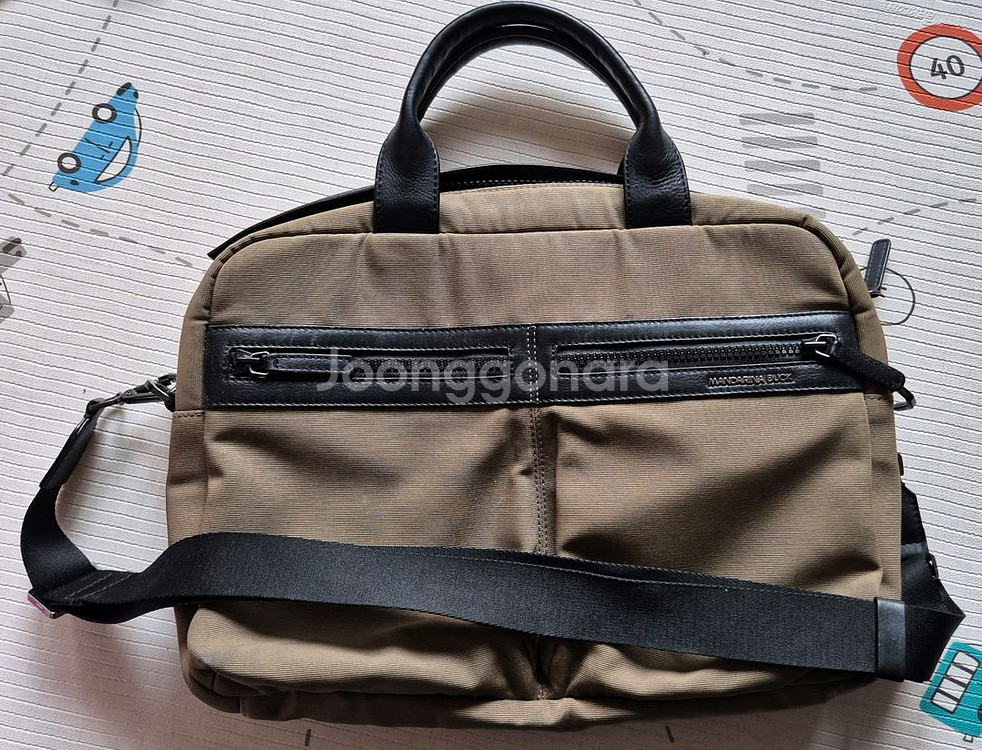 맨하탄백 브리프케이스로 실용적인 비즈니스백 카키색 외관에 블랙 가죽 손잡이와 스트랩 만다리나덕 서류 노트북 가방 - 가로 40cm, 세로 30cm, 폭 8cm - 노트북 수납 및 캐리어 거치용 지퍼 - 자연스런 사용감과 약간의 때 탐 외에 하자 없음