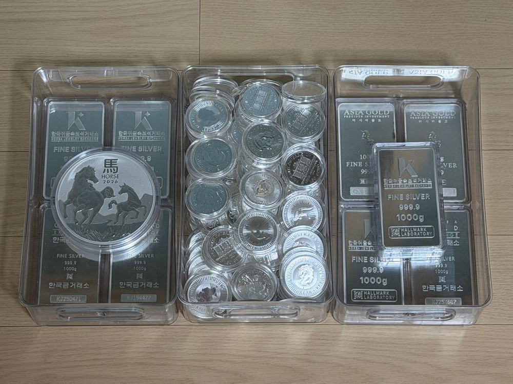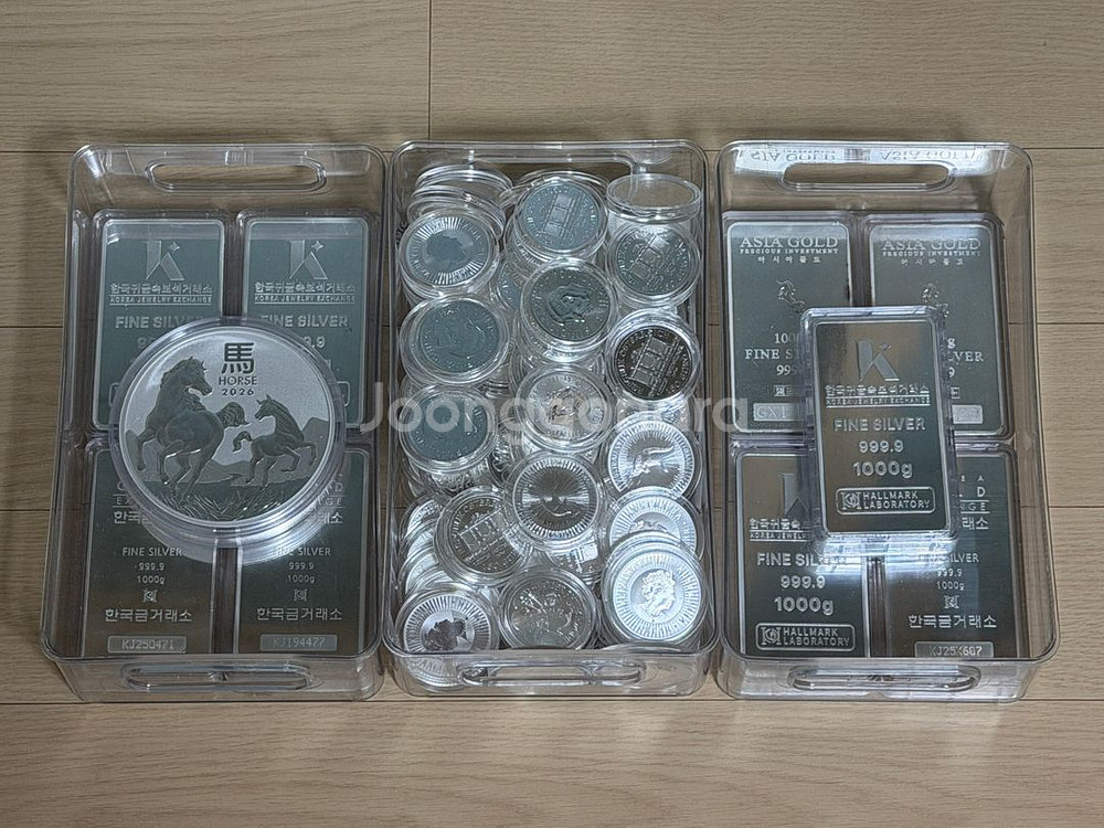 여러 종류 있습니다. 시세변동 상품이므로 시세에 따라 약간 달라질 수 있습니다 모두 9999 포나인 실버바/은화입니다. 모두 보증서 포함 풀구성입니다. [1월26일 기준] 한국금거래소 - 688만원 (공홈가 700만원대) 한국귀금속보석거래소 - 675만원 아시아골드 - 675만원 (미세흑점) 호주조폐국 2026년 말의해 은화 - 655만원 (캡슐링 되어 있음) - 순은 9999 호주조폐국 2025년 코알라 은화 - 655만원 (캡슐링 되어 있음) - 순은 9999 직거래는 김포 풍무에서 가능합니다 (현금거래 또는 상호 신분증 확인하에 이체거래) 안심결제는 수수료 3% 추가해주셔야 하며 일반택배거래는 별도의 수수료 추가없습니다. 3자사기 안당합니다. 채팅주세요