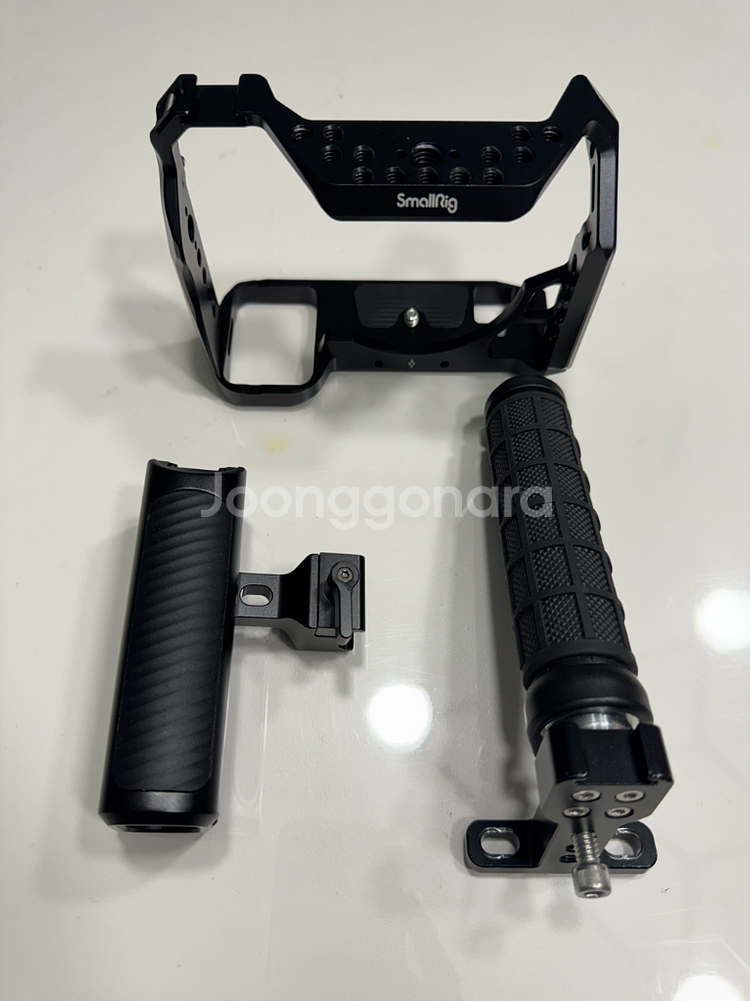 안녕하세요~^^ 딸 영상 찍어 주려고 a7s3 구매하고 스몰리그 케이지도 같이 구매했는데요, 휴대폰으로 주로 찍고 사용을 못하다보니 카메라도 팔고 케이지도 팔게 되었습니다. 상태 깨끗하고 필수라고 생각하는 구성으로 알차게 구매한 것입니다. 스몰리그 정품이고요. 각개로도 구매 가능하세요.^^ 1. 본체 케이지: 9만원 2. 핸드 헬드(사이드): 5만원 3. 핸드 헬드(탑): 3만원