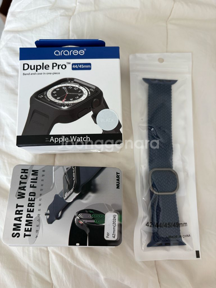 애플워치 스트랩, 보호필름 일괄 판매 합니다. 모두 새거고요. - 밴드는 아라리 애플워치 듀플 프로 풀커버 보호 일체형 스트랩 44 / 45mm 새제품 입니다. - 누아트 액정 보호필름 새제품 이고요 - 운동 혹은 여행용으로 좋은 구성 입니다. - 우븐 스트랩 같이 드릴께요.