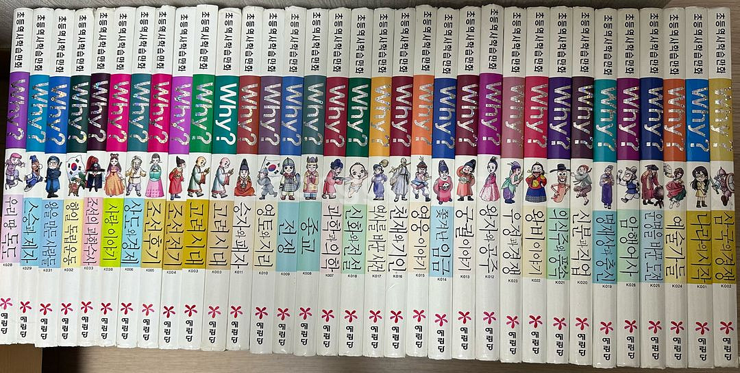 Why? 학습만화 시리즈입니다 한국사 33권(고려시대 2권) 세계사 23권 과학(?) 5권 와이책은 새책은 너무 비싸고 대체적으로 가볍게 읽으니 증고가 좋을것 같아 알라딘에서 낱권으로 따로 산것도 있고 중고로 구입한것도 있습니다. (조선후기나 독도 책은 구겨짐이나 찢김이 한두장 있습니다.) 한꺼번에 모두 가져가실분만 연락 주세요.
