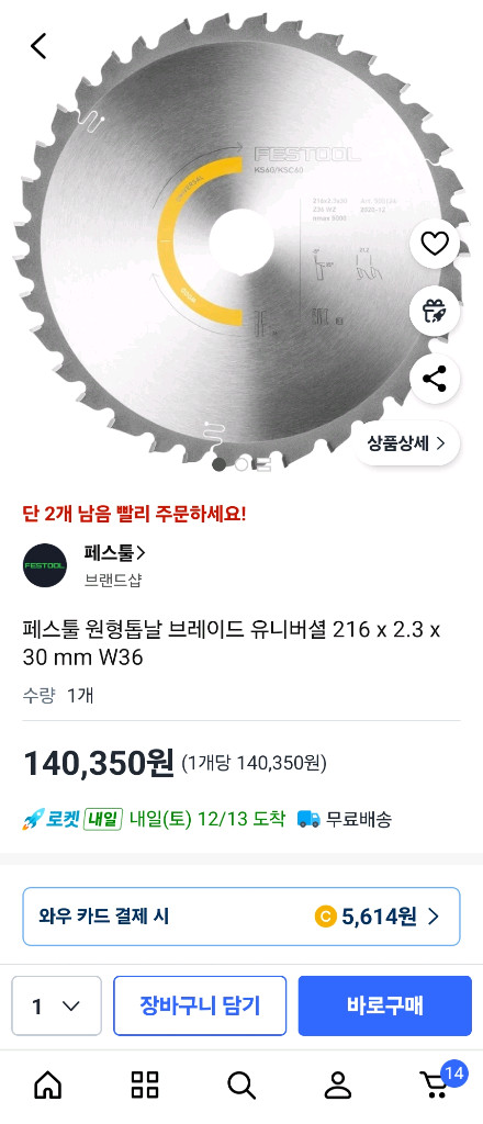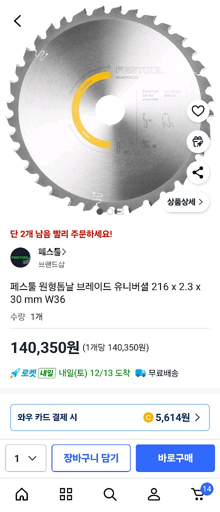 개인정보(거래정보)를 주고받는 행위는 사기에 노출될 수 있으므로 즉시 중고나라로 신고해 주세요페스툴 원형톱날 브레이드입니다. 216x2.3x30mm 사이즈로 목재나 금속 절단용으로 사용 가능해요. 상태 양호한 새 제품입니다 ksc60 구매후 미사용하고 바로 탈거해놨던 제품입니다.