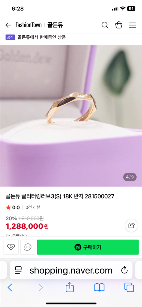 개인정보(거래정보)를 주고받는 행위는 사기에 노출될 수 있으므로 즉시 중고나라로 신고해 주세요골든듀 18K 골드 반지 보증서 분실로 저렴하게 드립니다 거의 한돈에 가까워 투자용으로도 좋아요 세척 완료 새 상품은 아니니 미세한 기스 있을 수 있으나 상태 양호하며 반짝임이 남다른 상품 11호