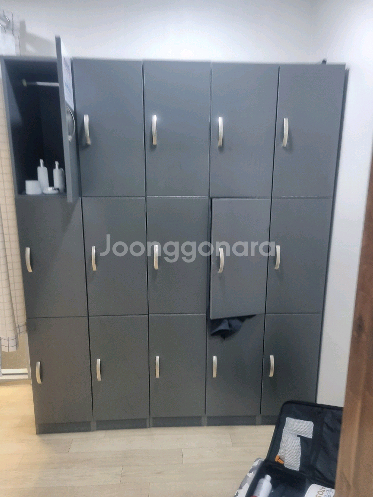 깔끔한 그레이 컬러의 대형 수납장이에요. 여러 개의 수납공간과 문이 있어서 실용적이고, 상태도 양호해 보입니다. 한줄당 가격입니다. 6줄 일괄구매시 할인가능