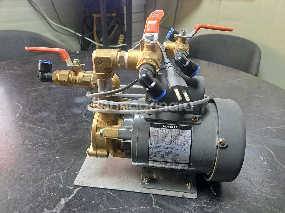 한일 브랜드의 PH-100wm모델 고압펌프입니다. 골드 컬러의 메탈 부품과 그레이 케이스로 구성되어 있고, 사용감은 있지만 작동 상태 양호해 보여요.
