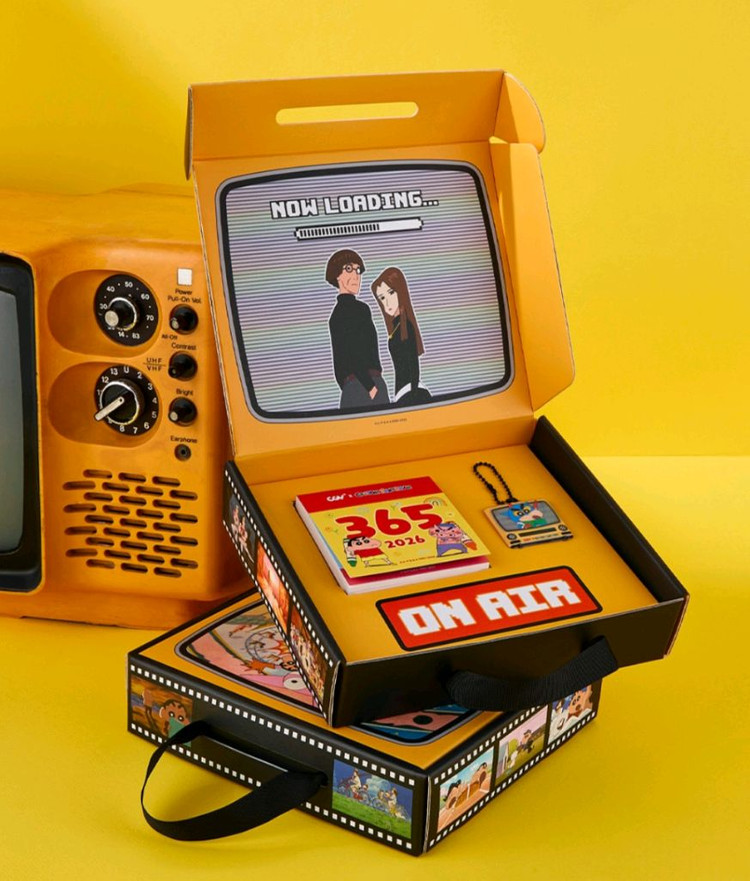 CGV 짱구 2026 캘린더 세트입니다 구성품: - 캘린더 - 패키지 - 365 메모지 - NFC 키링 *26년 매점/매표 쿠폰은 제외입니다