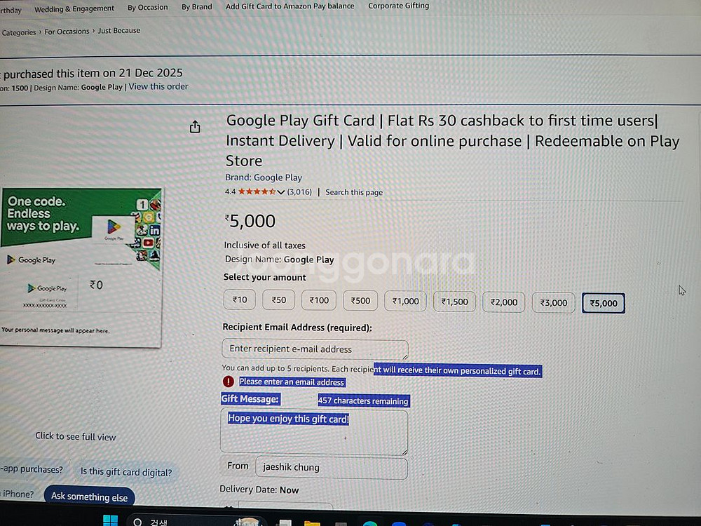 인도구글 플레이 스토어에서 사용 가능한 5천루피 기프트카드예요. 온라인 구매용으로 바로 사용 가능하고, 미사용 상태입니다. https://blog.naver.com/leedh428/223744611020