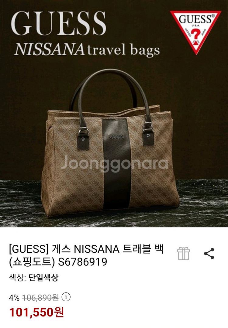 GUESS정품)게스NISSANA트래블 백(쇼핑도트)미개봉 GUESS NISSANA TRAVEL BAGS SHOPPER TOYE 정품 Style:S6786919 시중가격 102000원 여성분에게 선물추천 (30~50대 ) 택배무료 직거래시 관악구청룡동부분 (직거래시 1만원할인)