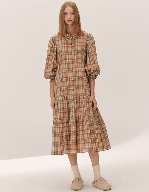 가을가을한 느낌의 체크원피스예요 티어드 치맛단과 퍼프 소매가 귀여워요 S사이즈