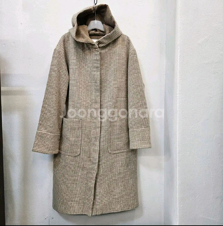 MUST BE 브랜드의 체크 패턴 후드 롱코트입니다 폴리에스터 78%, 모 17% 혼방 소재로 제작되었어요 지퍼락으로 편해요 상태좋아요 사이즈 55~66초 가슴단면 49 길이 98