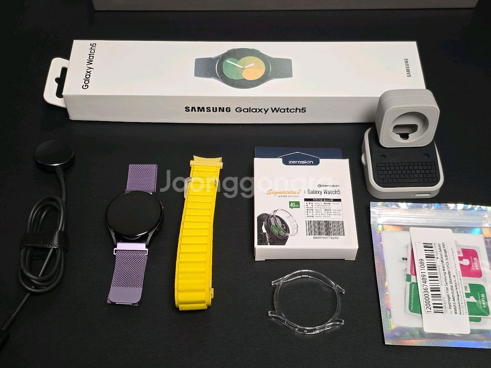 정리하다가 보관하고 있던 갤럭시워치5 판매합니다. 사진보면 아시겠지만 사용감이 극히 적습니다. 외관, 액정 기스없이 꺠끗합니다. 시계용으로 몇개월 사용하고 보관하여 배터리도 넉넉합니다. 기본 스트랩은 없이 밀레니즈 루프 스트랩과 추가스트랩 드립니다. 그 외 제로스킨 하드케이스 2개, 액정필름 4개, 충전기 홀더 드립니다. 충전기 홀더는 애플워치용이나 꾹누르면 고정됩니다. [구성품] - 스트랩 2개 (기본스트랩은 없음) - 정품 충전기 및 박스포함 - 제로스킨 하드케이스 2개 - 액정 필름 4개 - 충전기 홀더