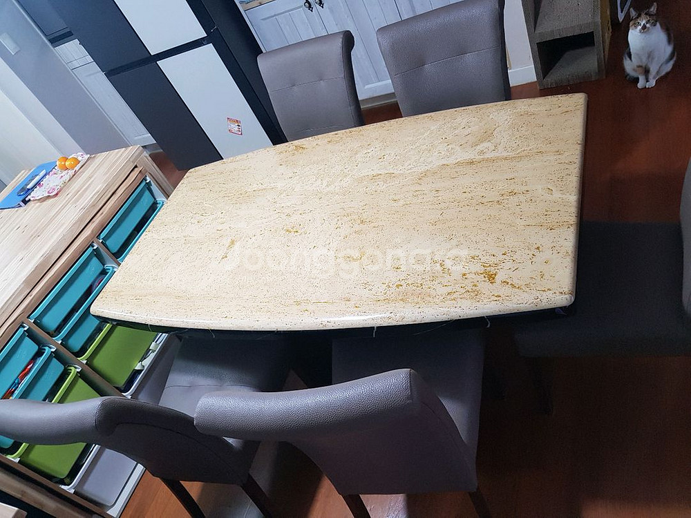 대리석 상판의 고급스러운 식탁 의자세트. 사용감은 있지만 튼튼하고 내구성이 좋아서 오래 쓸 수 있어요. 모던한 디자인으로 어떤 인테리어에도 잘 어울릴 것 같아요. 155*90 가져가시는날 1월20일,21일,22일 가능합니다.