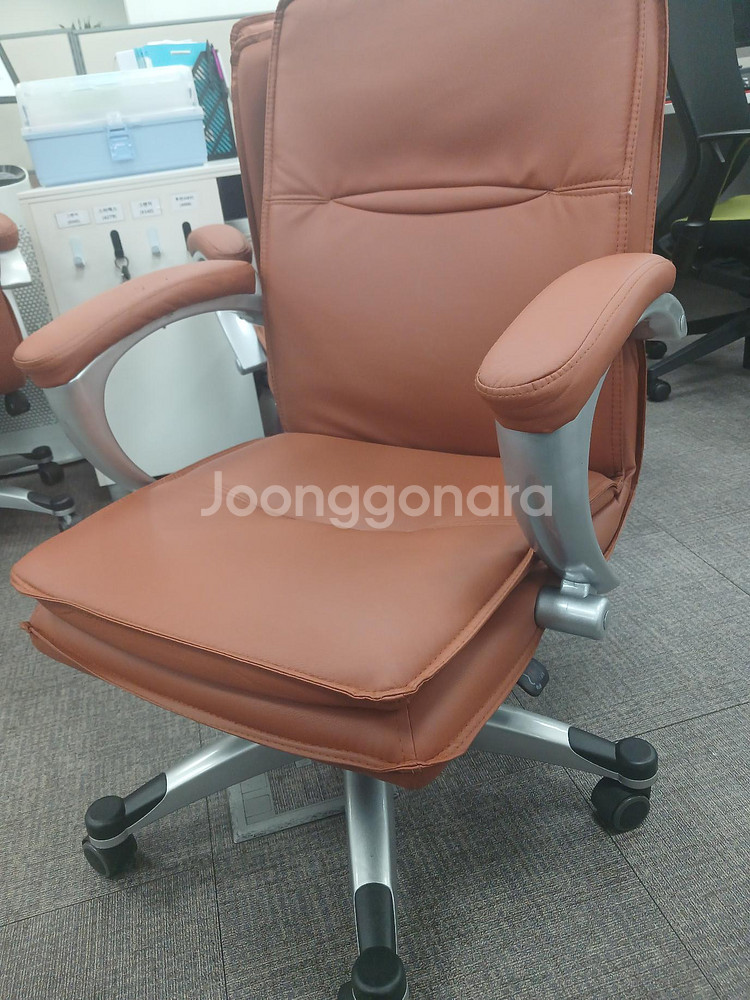 인체공학적 디자인의 사무용 의자예요. 브라운 가죽 시트와 실버 프레임으로 고급스럽고, 사용감은 있지만 상태 양호합니다.