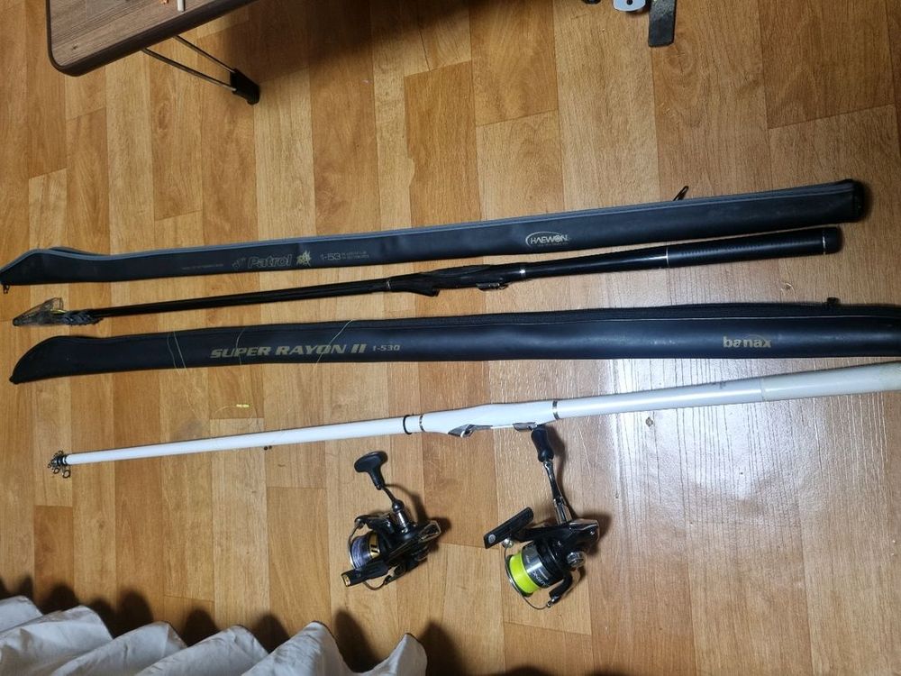 낚시대 2대와 릴 2대 일괄 판매합니다 - 낚시대: - Patrol 1-53 - Banax Super Rayon II 1-530(끝 초리팁만 날라갔음 근처낚시방 가면 얼마안합니다) - 릴: - Daiwa Legalis LT 3000-C(레가리스 LT3000c) - Shimano Aernos (아에르노스 2000번대) 갯바위 찌낚시 전용대이며 생활기스있습니다. 2회출조후 방치만 했습니다. 낚시대 흰색은 끝초리팁만 날라감 수리시 많아도 1만~1만5천 정도밖에안합니다. 릴두개는 라인 만땅감겨져있습니다. 낚시대에 찌감겨져있는거 그대로 다드립니다 릴 박스보증서없음 낚시대는 보증서없이 as수리가능합니다. 일괄로만 판매할게요 싸게내놨어요. 대구 직거래이며 택배도됩니다