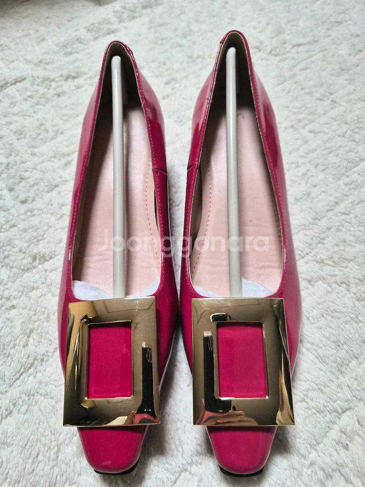 245사이즈 여성구두예요. 핑크 컬러에 골드 장식이 포인트로 되어있어서 예뻐요. 사서 한번도 안신은 친구에요. 아깝지만 처분합니다.ㅠ