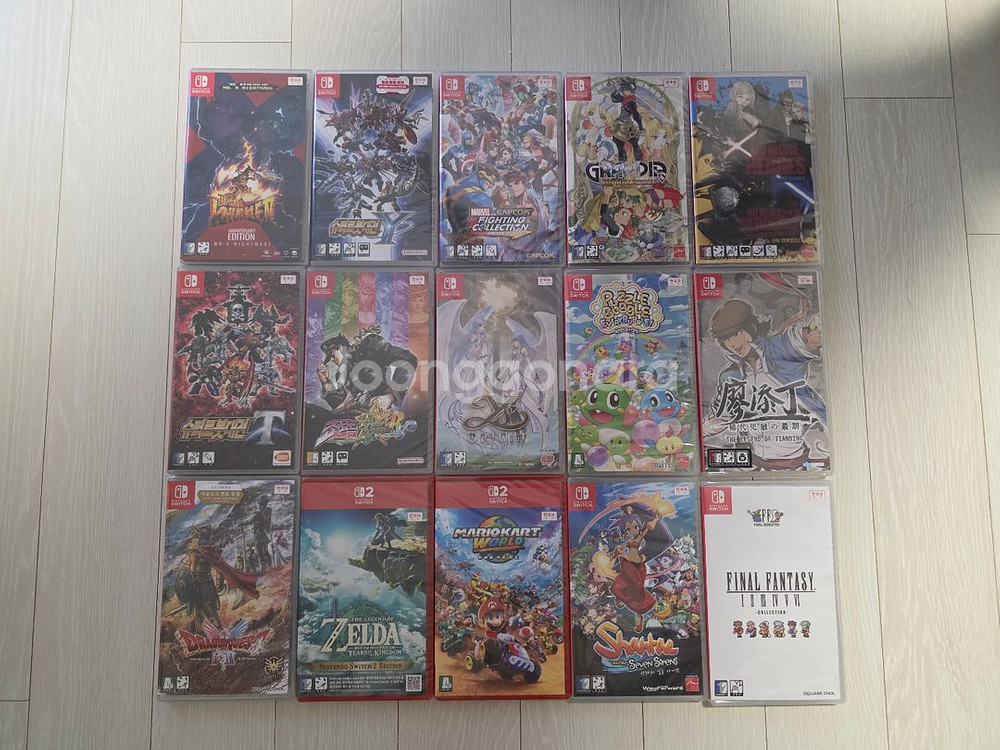 닌텐도 스위치 새상품 타이틀 팝니다. 1. 베어너클4 애니버서리 에디션 : 75,000원 2. 슈퍼로봇대전 Y : 62,000원 3. 마블vs캡콤 파이팅 컬렉션 : 60,000원 4. 그란디아 HD 컬렉션 : 65,000원 5. 노 모어 히어로즈 1+2 : 75,000원 6. 슈퍼로봇대전 T : 45,000원 7. 죠죠의 기묘한 모험 : 80,000원 8. 이스 오리진 : 35.000원 9. 퍼즐버블 에브리 버블 : 25,000원 10. 더 레젠드 오브 티안딩 : 75,000원 11. 스위치 1 드래곤 퀘스트 1&2 : 63,000원 12. 스위치2 젤다의 전설 티어스 오브 더 킹덤 : 65,000원 13. 스위치2 마리오 카트 월드 : 65,000원 14. 샨테와 일곱 사이렌 : 30,000원 15. 파이널판타지 1-6 : 90,000원 모두 미개봉 새상품 입니다. 10번 만 해외판이며 나머지 국내 정발 입니다. 직거래시 성남 야탑동 매화마을4단지 앞에서 가능하며 택배 거래시 반값택배 2,000원 일반택배 4,000원 추가됩니다
