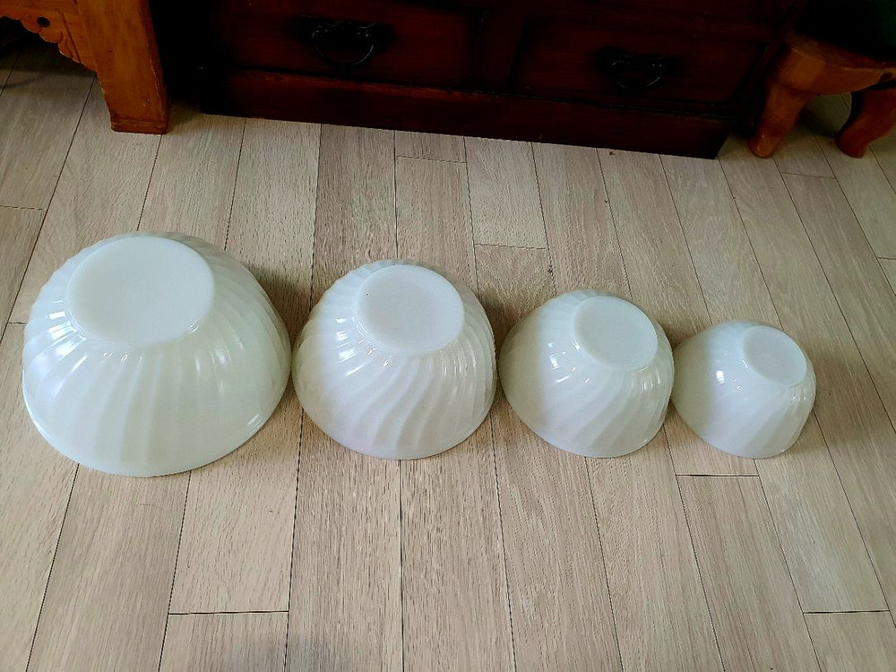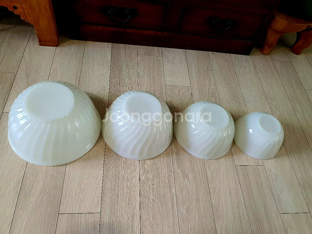 빈티지 밀크글라스 믹싱볼중 제일 귀템인 파이어킹 쉘 믹싱볼입니다 4개셋트가격입니다 마지막 제일 큰 아이 정말 큼지막하네요 뽀연 밀크 글라스에 쉘이 멋진 아이들 특히 파이어킹 쉘 믹싱볼은 파이어킹 일반 믹싱볼보다 훨씬 귀하며 또한 일반 파이어킹 믹싱볼도 파이렉스처럼 흔치 않은 귀한 제품이랍니다 시중에 대부분 파이렉스는 많지만 요 파이어킹 쉘은 일반 파이어킹에 비해 더더욱 좀처럼 보기 힘들죠 흔한 파이렉스에 비하면 현지에서도 소장하기도 힘든 귀한 아이템로 알고있습니다 주방에 소품뿐 아니라 실사용으로도 굿입니다 특히 전자렌지는 물론 식기세척기 오븐에도 사용가능해 큰 장점이지요 요즘엔 빈티지 밀크글라스 가격이 많이 올라서 입고자체가 힘드네요 머그하나도 대부분 4만원 이상부터 10만원도 있어요 이제품은 대략 50년대 제품이고 수십년의 세월동안 미세한 스크레치보일수있지만 칩같은것 전혀없어요 50년대 기술수준으로 모든 파이어킹등 빈티지 밀크글라스는 흰점이나 거친부분 그런거 보일수있음다 수십년된 아이들이 요즘 새것과같을수는없지만 새것 수준에 준합니다 밑에 마크 다 있음다 요아이들 많이 두툼하고 쉽게 깨지지않은 장점을 가지고 있어요 4개셋 일괄로 판매해요 검색해보시면 파이어킹 쉘은 귀하고 비싸답니다 흔한 파이렉스하고는 달라요 직거래 위주지만 파손면책하에 택배 5000별도 또는 착불로도 보냅니다 섬세한 유리제품 수없이 보냈어도 완전포장으로 파손한번 없었으니 안심하셔도 전혀 문제없을겁니다 제 상점에 이쁘고 신기한 빈티지앤틱 소품 많으니 많이들 구경하세요 24시간 열려있음다