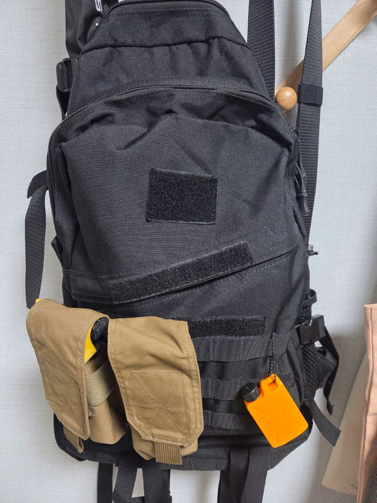 밀리터리 스타일의 캐주얼 백팩이에요. 블랙 컬러에 탄색 포켓과 벨크로 패치가 포인트로 되어있고, 실용적인 멀티포켓 구성으로 활용도가 높습니다.