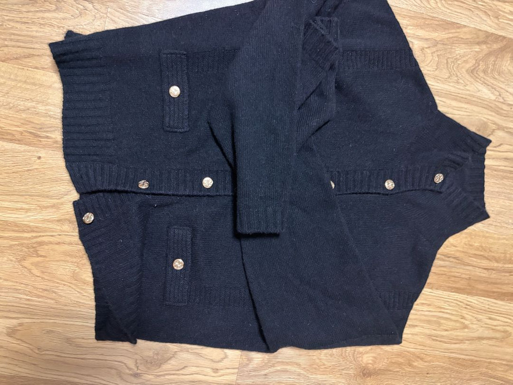 블랙 컬러 캐시미어 니트 가디건이에요. 앞면에 골드 버튼 장식이 포인트로 되어있고, 전체적으로 깔끔한 상태입니다. 프리사이즈 기재되어있는데 55까지 가능하실 것 같아요