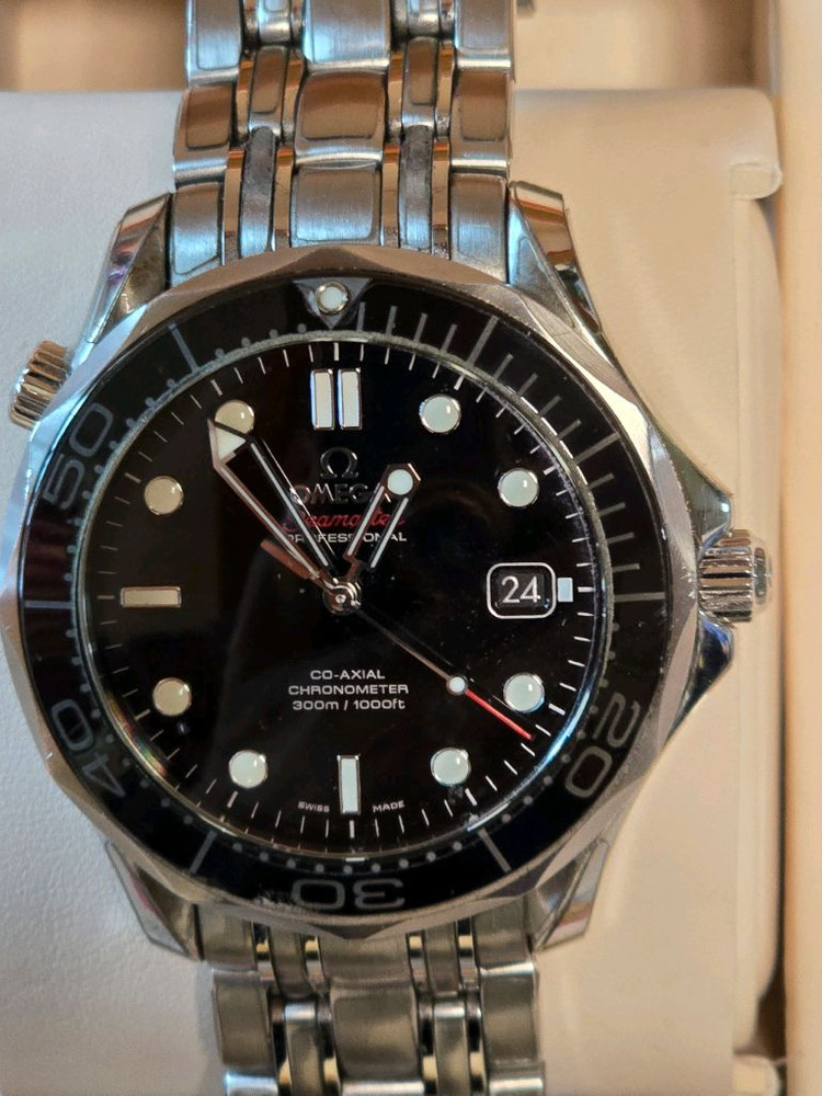 오메가 씨마스터 다이버 300 시계입니다 - 모델명: 210.30.42.20.01 - OMEGA Co-Axial Master Chronometer 8800 무브먼트 - 41mm 남성 시계 - 블랙 다이얼, 스테인리스 스틸 브레이슬릿 - 여분의 시곗줄 - 필름부착으로 외관 매우양호 -2019.2 신세계백화점 강남점 스템핑(구형 마지막이라 희귀성) -착용이 적어 무폴리싱, 무오버홀 정품 박스, 보증서, 설명서 모두 포함되어 있습니다.