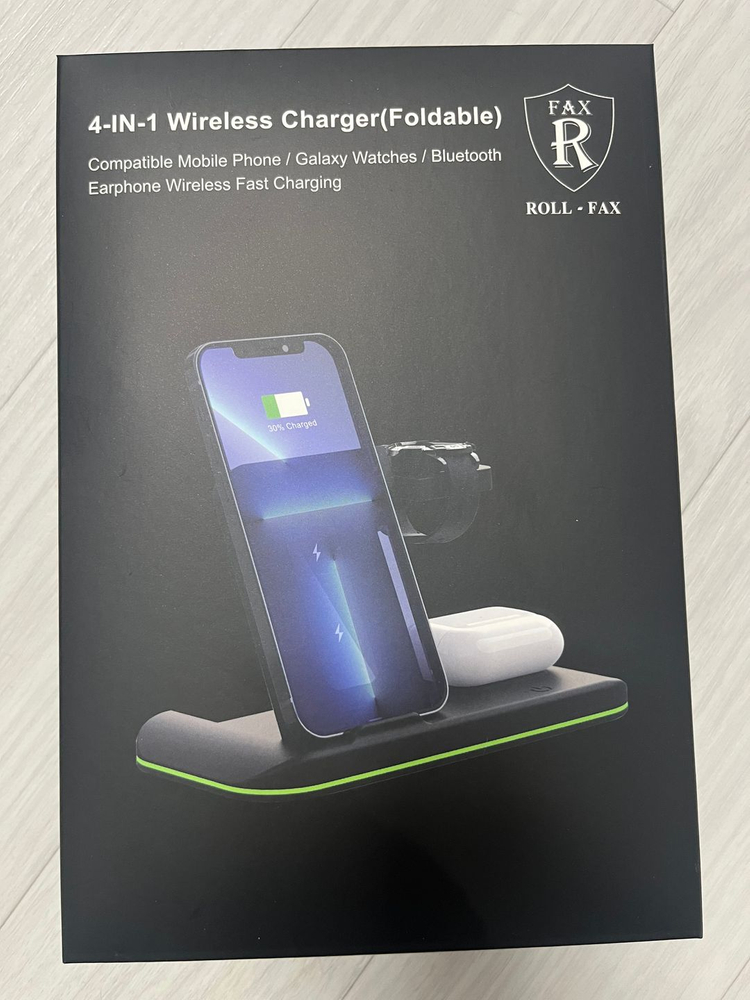 (미개봉) 듀얼코일 고급형 ROLL-FAX 4-in-1 접이식 스마트폰, 휴대폰, 핸드폰 무선 충전기입니다. - 디자인이 깔끔하고 이쁨, 갤럭시버전(블랙색상) - 일반 무선충전기거치대와 달리 더블(듀얼)코일 적용으로 충전가능 범위를 최대로 높혀 어떤방향으로든 충전 가능. (Z플립 시리즈 펼쳐서 충전가능) - 일반 무선충전기거치대와 다르게 충전부위 전체가 접혀서 보관 및 편리 합니다. (접어서도 충전가능) - 갤럭시 (버즈 이어폰, 스마트워치, usb 케이블) 충전 타입 4가지를 동시에 충전할 수 있습니다. - 고속 무선충전 지원으로 시간을 절약가능. - 스위치 버튼으로 무드등 기능 탑재. - 미개봉 새상품으로 선물용 으로도 추천드려요 !! 택배 포함 가격입니다