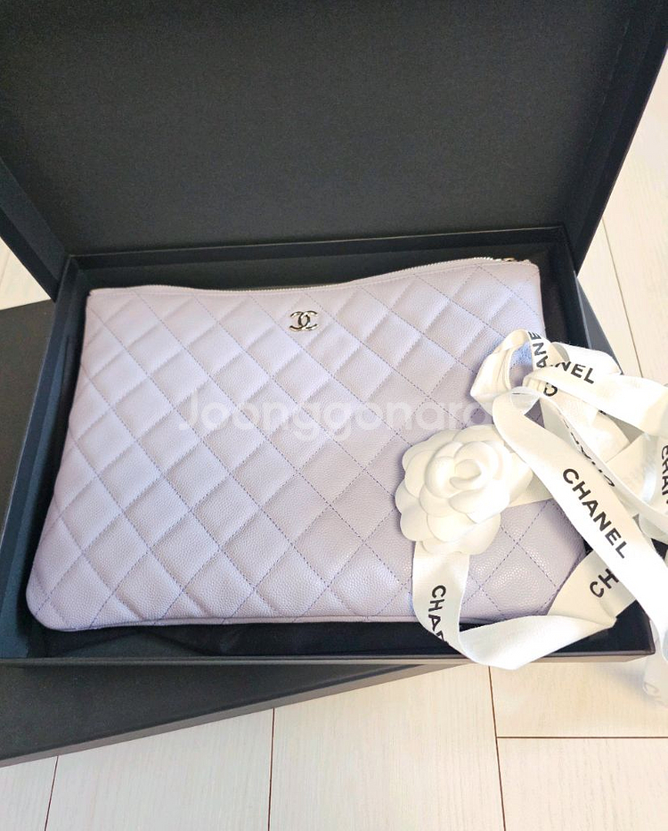 샤넬 캐비어 퀼팅 클러치 연보라 은장 뉴미듐 사이즈입니다 가로 27cm 세로 20cm 당연히 정품이구요 박스 파우치 까멜리아 리본 등 구매할 때 구성품 그대로에 이너백도 같이 드릴게요 구매하고 보관만 했던 상품이라 모서리 까짐 가죽 늘어남 등등 없이 컨디션 좋아요 구하기 힘든 컬러라 어렵게 구했다가 애낳고 클러치 안들게돼 내놓습니다 에눌 문의는 정중히 사양합니다