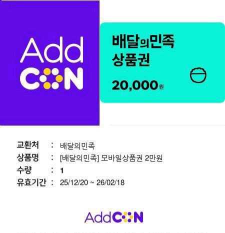 배민 배달의민족 2만원 상품권입니다. 기간은 26년2월18일까지입니다.