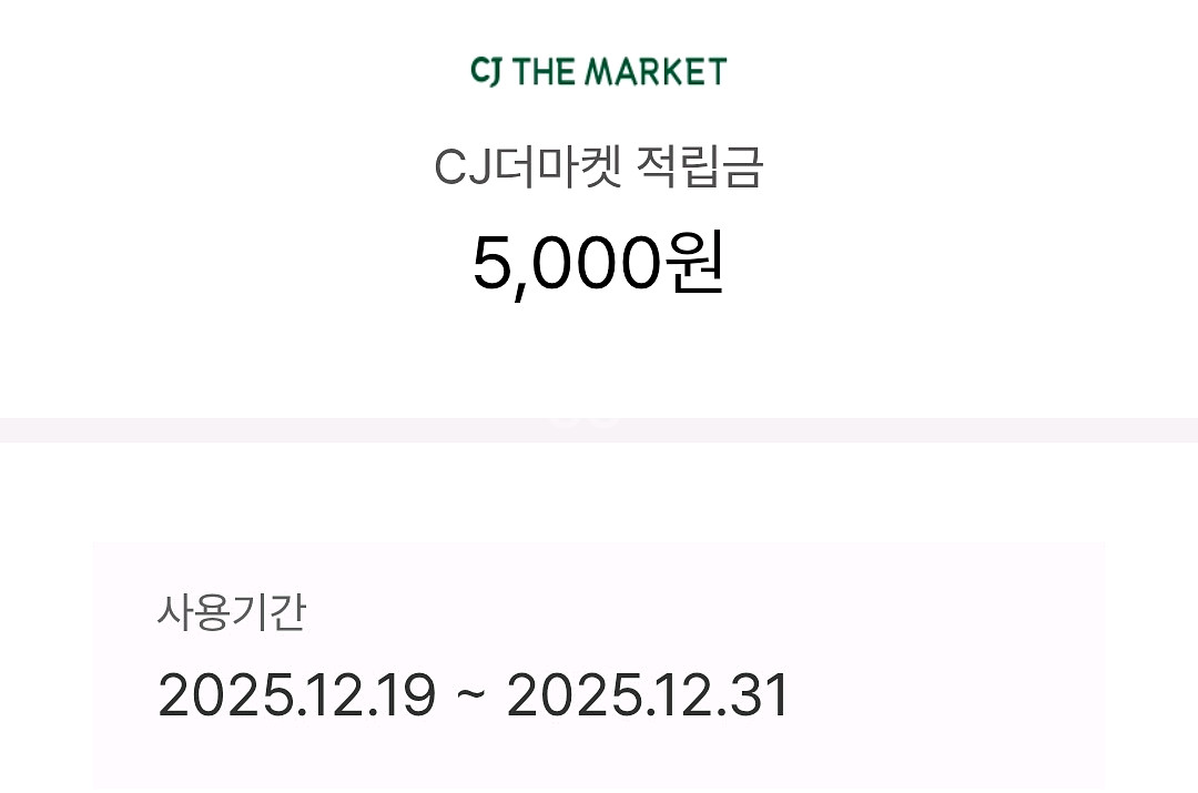 ## CJ 더마켓 5천원 적립금 : 00원 ## 유효기간 : ~2025.12.31 - cj one에서 발급된 쿠폰(중복등록불가) ## 구매후 핀번호 노출로 환불은 불가 (캡쳐본전송) - CJ더마켓 APP에서 쿠폰번호 등록 사용 - 쿠폰번호 등록 시, 대소문자 구분하여 등록 (ID당 1회만 등록 가능) - 적립금 등록기간: ~2025년 12월 31일 까지 - 적립금 사용기간: ~2026년 1월 31일 까지 - 적립금은 취소시 유효기간이 남아있을 경우 자동환원