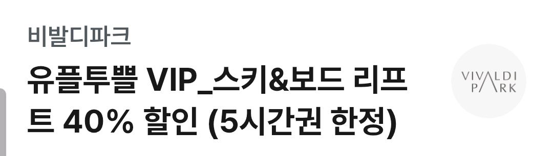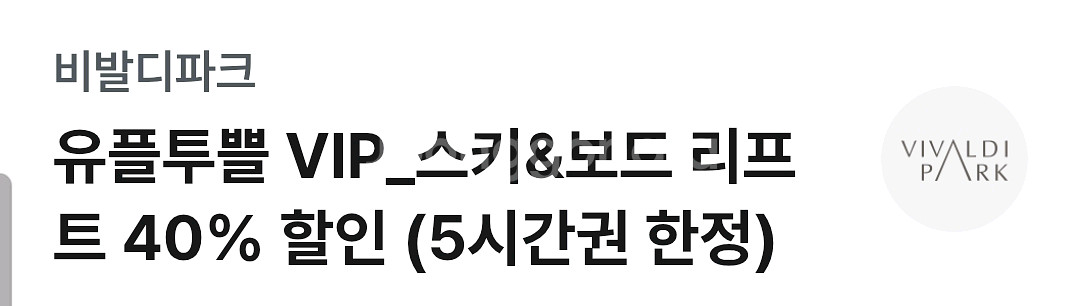 비발디파크 스키장에서 사용 가능한 스키&보드 리프트 40% 할인권이에요. 5시간권 한정으로 슬로프 이용 시간을 40% 할인해줍니다. 미사용 새 상품으로 깨끗한 상태예요! 26.3.2일 까지 이고 사용방법 이미지 참조해주시고 2장 남았습니다