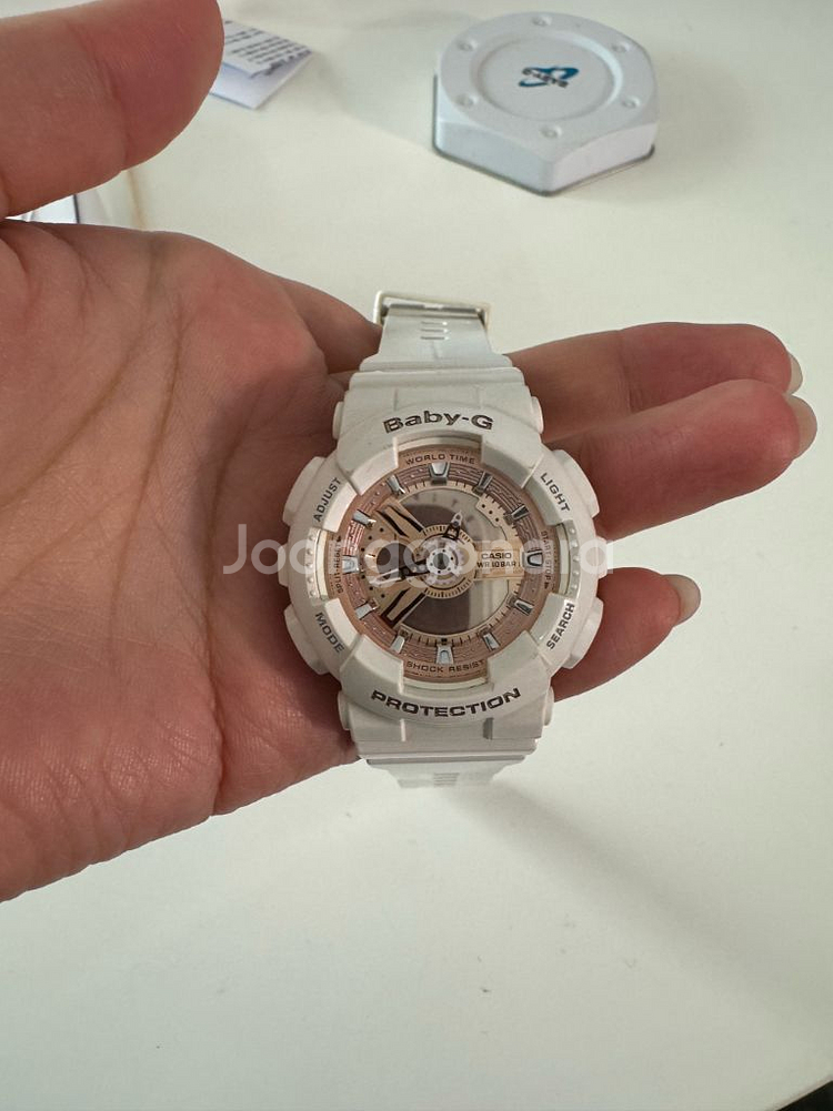 카시오 베이비지 시계예요! 화이트 케이스에 로즈골드 시계약을 교체해야하며, 화이트 특성상 색바래있고, 기스도 있어요 사진참고 해주세요