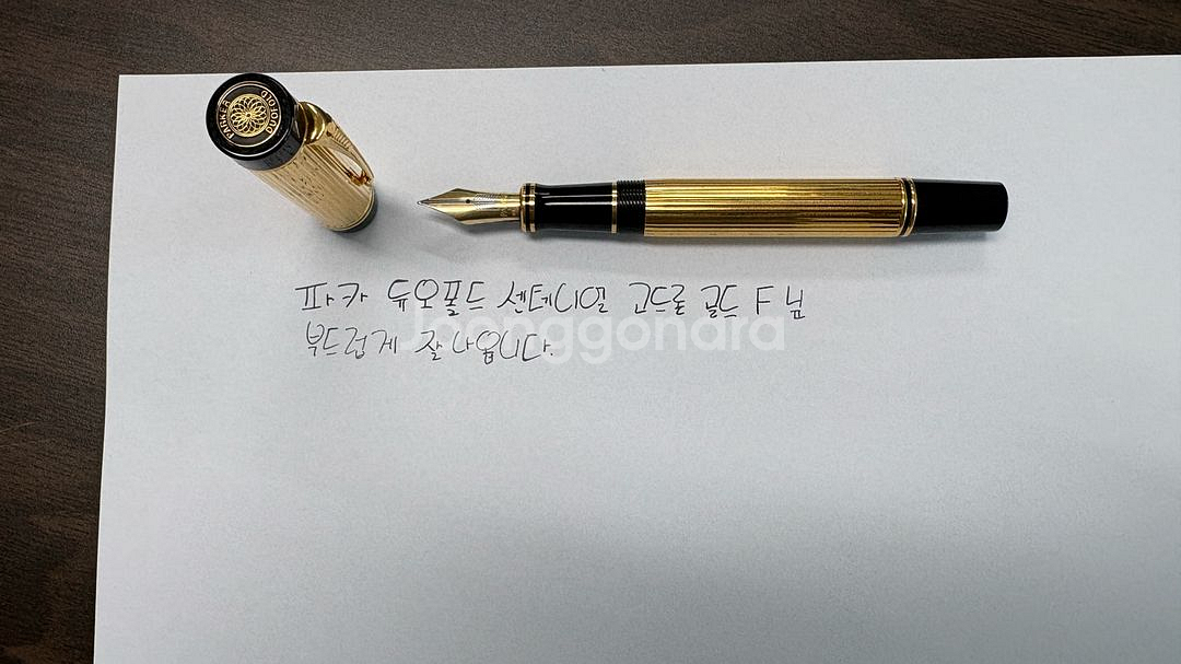파카 듀오폴드 센테니얼 고드론 골드 F닙 만년필 입니다. 듀오폴드 작은 인터내셔널 제품이 아닌 큰 모델인 센테니얼 제품입니다. 가격도 센테니얼이 더 웅장한 고급제품입니다. 고급스러운 23k 골드 제품 입니다. 구성은 만년필 단품입니다. 위 사진 옆으로 넘기시다 보시면 올린것 처럼 상태 좋은 제품 12월에 구입하여 2주? 정도 소유히다가 입문을 너무 과하게 한것같기도 하고 실버제품 m닙도 소유하고 있다보니 똑같은 제품보다 다른 회사의 만년필(펠리칸m1000)을 구입하고자 판매합니다. 저보다 이 만년필을 원하시는 분들에게 더욱 맞다고 생각하여 판매합니다. 구매 후 시필 한장과 자잘한 글 합하여 한장이라 가정하여 2장 정도 분량 사용하였고 1세대 닙 f는 진짜 너무 부드럽고 만족스럽습니다. 개인적으로 몽블랑149 f닙보다 부드러웠습니다. 파카 1세대 화살닙은 제 상품이 아니더라도 만년필을 좋아하신다면 꼭 써보시는것 추천드립니다. 제 위치가 전라북도라 혹시 직거래 원할시 채팅 주세요. 택배배송은 안전하게 잘 포장하여 보내드리겠습니다.