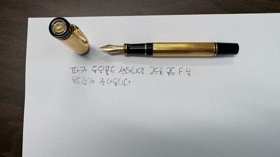 (25.12.31 까지만 판매 예정) 파카 듀오폴드 센테니얼 고드론 골드 F닙 만년필 입니다. 듀오폴드 작은 인터내셔널 제품이 아닌 큰 모델인 센테니얼 제품입니다. 가격도 센테니얼이 더 웅장한 고급제품입니다. 캡과 배럴이 고급스러운 23k 골드 제품 입니다. 님은 1세대 화살닙 18k 입니다. 구성은 만년필 단품입니다. 위 사진 옆으로 넘기시다 보시면 올린것 처럼 상태 좋은 제품 12월에 구입하여 2주? 정도 소유히다가 입문을 너무 과하게 한것같기도 하고 실버제품 m닙도 소유하고 있다보니 똑같은 제품보다 다른 회사의 만년필(펠리칸m1000)을 구입하고자 판매합니다. 저보다 이 만년필을 원하시는 분들에게 더욱 맞다고 생각하여 판매합니다. 구매 후 시필 한장과 자잘한 글 합하여 한장이라 가정하여 2장 정도 분량 사용하였고 1세대 닙 f는 진짜 너무 부드럽고 만족스럽습니다. 개인적으로 몽블랑149 f닙보다 부드러웠습니다. 파카 1세대 화살닙은 제 상품이 아니더라도 만년필을 좋아하신다면 꼭 써보시는것 추천드립니다. 제 위치가 전라북도라 혹시 직거래 원할시 채팅 주세요. 택배배송은 안전하게 잘 포장하여 보내드리겠습니다.