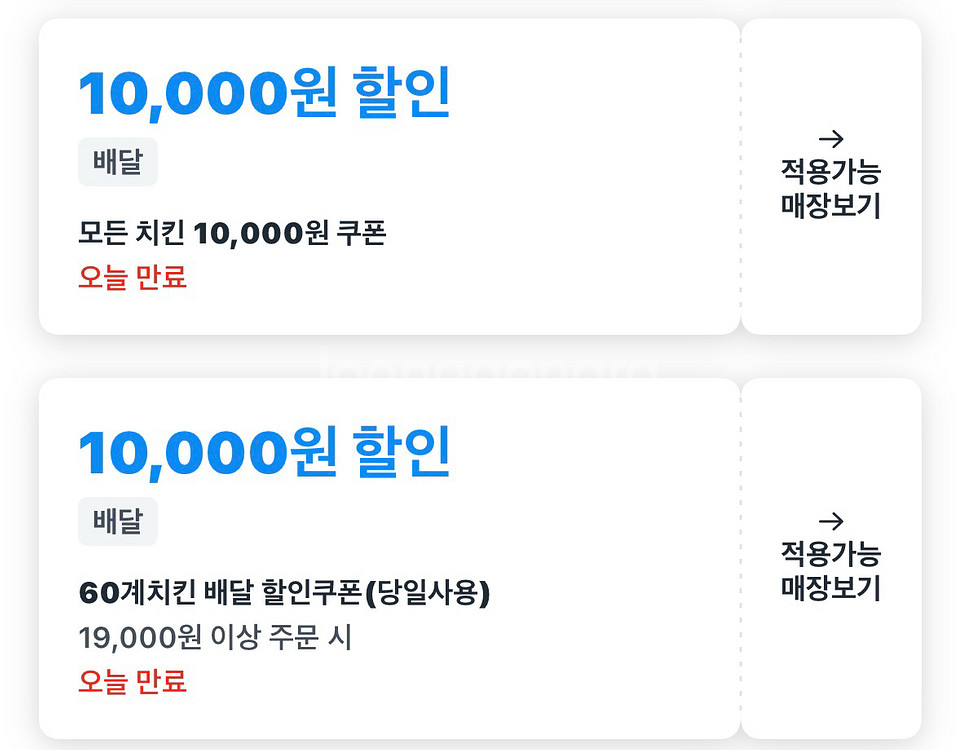 쿠팡이츠 할인쿠폰 판매해요 12/25까지입니다 할인금액제외한 최종결제금액에 더해서 보내주시면 됩니다 남은쿠폰 모든 치킨 1만원 할인 (이것만 4천원에 판매) -> 이건 금액 제한 없어요 모든 치킨 브랜드 가능 닭강정집이나 kfc 햄버거 세트 이런것도 가능함 최소금액제한 1만원인 곳에서 1만원어치 사면 0원에 구매가능한거에요