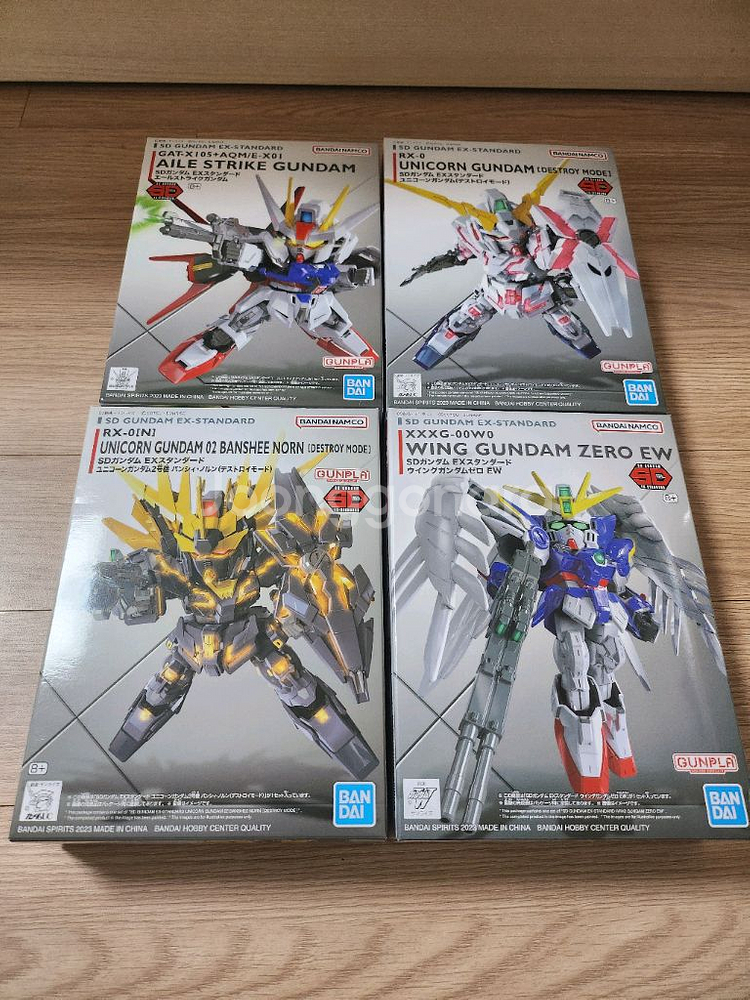 건담 프라모델 4개 세트로 아일 스트라이크 건담, 유니콘 건담, 윙 건담이 포함되어 있어요. 박스 상태가 깨끗하고 미조립 새제품 상태입니다.