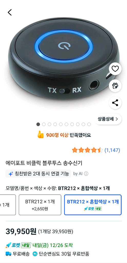 에이포트 비클릭 블루투스 송수신기 BTR212입니다. 송신과 수신 모두 가능합니다. 필요에 따라 TX/RX 모드를 전환하여 사용하시면 됩니다. 2대 동시 연결 가능합니다. 문의 없으시면 바로 안전결제해주시면 됩니다!