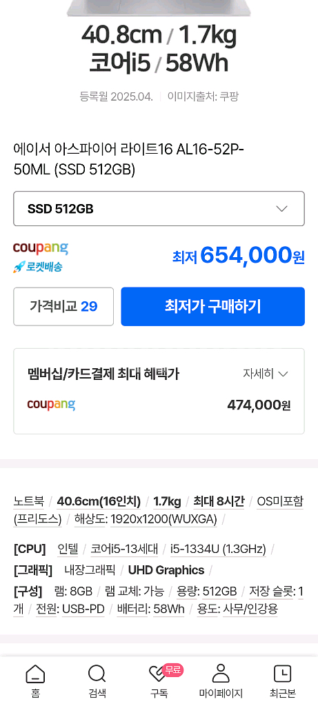 에이서 아스파이어 라이트16 램 원래 8기가인데 8기가 추가해서 지금은 16기가에요 다른 사양은 스크린샷 참고해 주세요