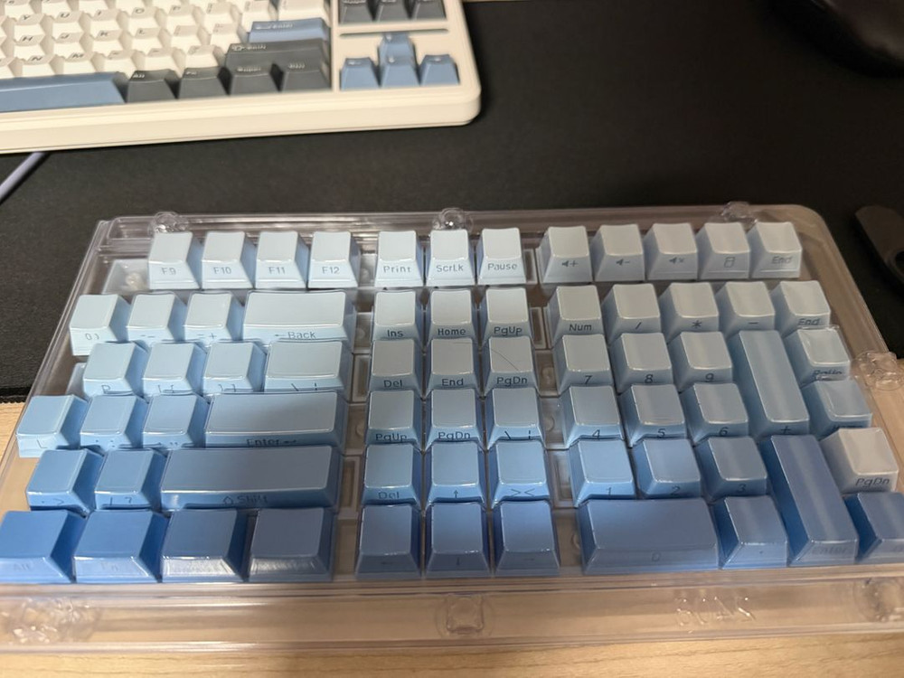블루 색상 그라데이션 키캡 판매합니다 화이트셋업 맞추려다가 그냥 블랙셋업 유지함으로 인해 새상품 그대로 두었던 것입니다 새상품이니 걱정없이 구매하셔도 됩니다