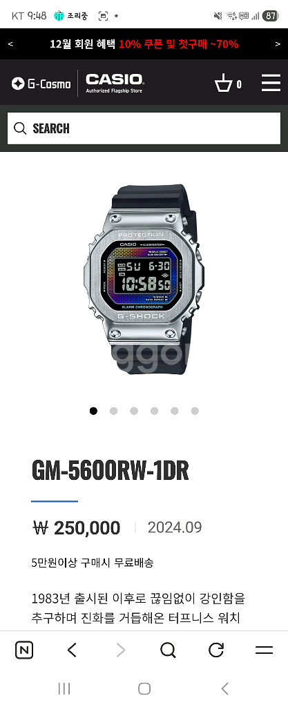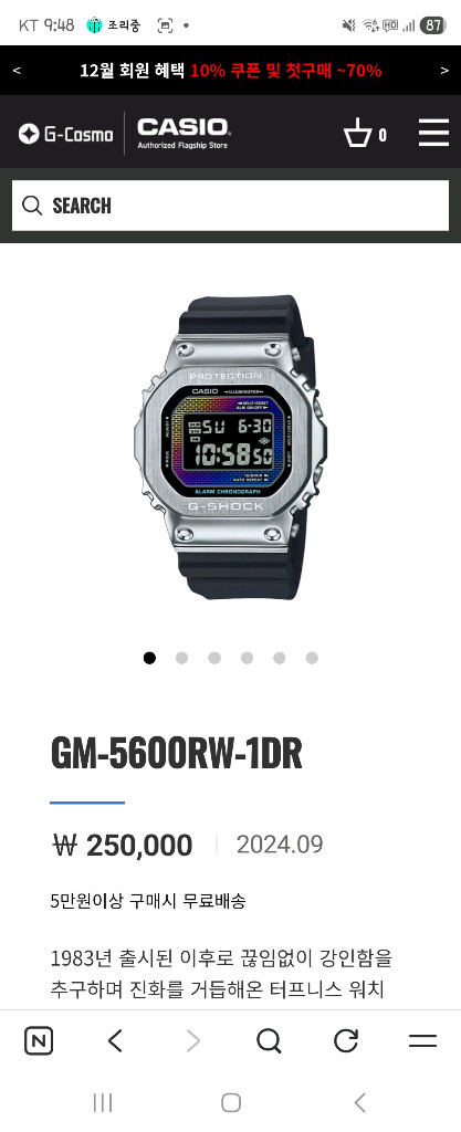 지샥 GM-5600RW-1DR 메탈 시계입니다. 은색 메탈 케이스에 검정색 우레탄 밴드가 잘 어울립니다. 액정이 컬러풀해서 더욱 눈에 띄는 모델입니다. 문의 없으시면 바로 안전결제해주시면 됩니다! 실착0회