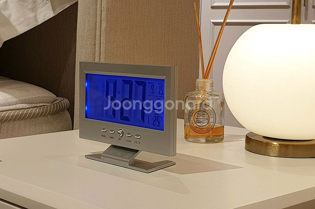 가성비 최고의 탁상 LCD 알람 시계 . 시원하고 큰 액정창 깨끗하고 시인성 높은 블루라이트 침대 옆, 아이방, 거실에 놓고 사용 하시면 아주 좋습니다 소리에 따라 라이트 자동 ON/OFF 절전기능 알람 기능 추가. 깨끗한 실버 칼라 AAA 건전지 2개 무료제공 미사용 새제품 .
