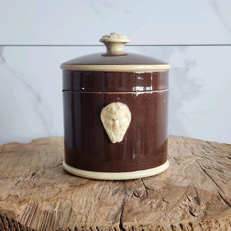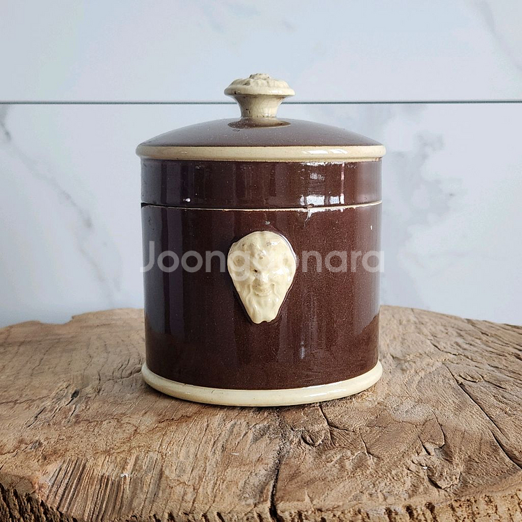 사이즈 약 높이 14cm 내부지름 10.5cm 백마크 O 앤틱 프랑스 sarreguemines에서 제작된 라이언 헤드 팟입니다. 브라운 유약 위에 아이보리 라인이 둘러져 있어 클래식한 분위기를 주며 전면에 입체적으로 표현된 얼굴 모티브 장식이 포인트가 되는 개성 있는 디자인입니다. 뚜껑과 바디 모두 묵직한 도자기 재질로 제작되었으며 바디 부분의 칩과 뚜껑 안쪽 부분의 세월감이 느껴집니다. 하지만 전체적으로는 잘 보존되어온 상태로 사이즈가 큰 편에 속하며 바닥면에 백마크와 각인 함께합니다. *** 빈티지 제품 특성상 사용감, 세월감 있어요. 하자 발견시 말씀드리지만 제가 발견하지 못한 하자가 있을 수 있습니다. 교환/환불 불가. 빈티지 제품 이해하는 분만 구매해주세요. ***