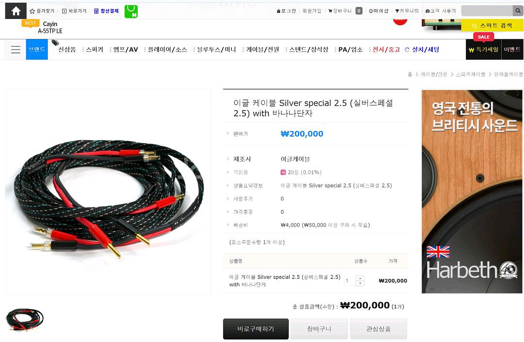 독일 이글케이블사의 실버스페셜 2.5 스피커 케이블 3미터 페어입니다. 단자는 양쪽 모두 바나나 플러그입니다. 고역의 선명도에 강점이 있는 은도금선이며 같은 독일 제조사인 엘락 스피커 상위기종의 배선재로 사용되어 입소문을 타기도 했습니다. 케이블이 이것저것 많아서 한번 물려보고 보관만 한 신품상태라 단자도 기스 없이 깨끗합니다. 택배/반택 모두 되고 직거래는 안양 평촌에서 가능합니다.