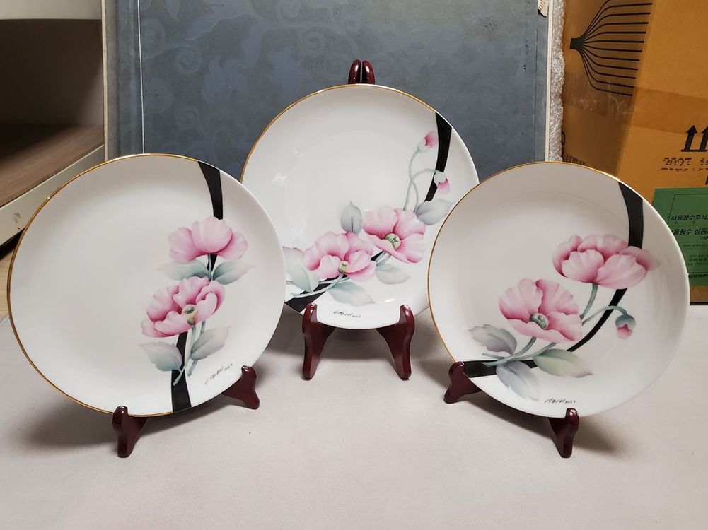 도자기 위에 직접 그린 양귀비 그림입니다 테두리는 실제 골드 용액입니다 도자기 등 재료 모두 수입(유럽,미국)에 의존하여 매우 고가이지만, 예쁜 도자기 좋아하시는 분께 일부 작품들 매우 저렴하게 판매합니다 (포슬린 작가 서명이 있습니다) 1번: 27.5, 24.5/3개 일괄 3만 2번: 지름24센티, 21센티/2개 일괄 2만 3번: 가로32 세로22/1만 (실제 색상보다 사진이 쨍하게 보이는 점 감안해 주세요) *시간과 금액 등 정성이 굉장히 많이 들어간 작품입니다;; 작품이 많아져 재료값의 반의반도 안되는 가격으로 드리니, 네고는 정중히 사양합니다ㅠ (여러개 구매시 접시 받침 서비스는 가능합니다) *반품,환불 불가하니 사진 확대하여 꼼꼼히 보시고 신중한 구매 부탁드립니다 *포슬린 아트란? 유럽, 미국 등에서 대중화 된 도자기 예술로, 유약처리 된 전용 백자 위에 특수안료와 오일을 이용해 그림을 그린 뒤 3~4회 가마에 구워내는 도자기 공예를 말한다. 인테리어용일 뿐 아니라, 인체에 무해한 허브재료를 사용하여 실사용도 가능하다.
