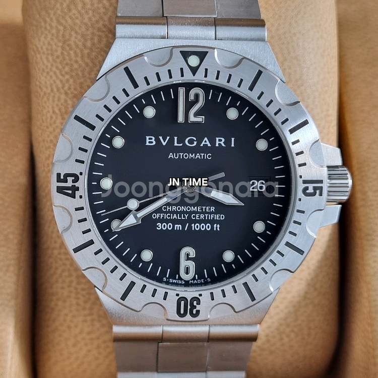 이번에 소개시켜 드릴 시계는 불가리 디아고노 프로페셔널 스쿠바 SD40S 모델입니다. 디아고노는 1988년 처음 출시된 이후, 이탈리아의 대담한 디자인과 스위스의 정밀한 시계 제조 기술을 결합한 불가리의 대표적인 스포츠 워치 라인업입니다. 스포티하면서도 럭셔리한 디자인 덕분에 과거부터 현재까지 국내외 많은 남성 연예인들과 셀러브리티들에게 큰 사랑을 받아온 모델입니다. 베젤에 새겨진 'BVLGARI BVLGARI' 로고와 다이빙 타임 인덱스가 조화를 이루어 브랜드 아이덴티티가 확실합니다. 어두운 물속에서도 시간을 잘 볼수 있도록 핸즈(바늘)와 인덱스에 야광 처리가 되어 있습니다. 블랙 매트 다이얼이 채택되었으며, 시인성이 좋은 야광 인덱스와 핸즈가 적용되어 야간이나 수중에서도 가독성이 뛰어납니다. 스틸 브레이슬릿 특유의 마디 구조 덕분에 착용감이 뛰어납니다. 무브 또한 크로노미터 COSC 인증을 받은 고정밀 무브먼트를 탑재하고 있습니다. 스포츠 워치의 역동성과 불가리 특유의 이탈리아 감성이 잘 결합된 모델이라 현재까지 빈티지 시장에서도 꾸준히 사랑받고 있습니다. 2024년에 오버홀과 소프트 폴리싱까지 했고 이후 거의 보관만 해서 오차 허용범위 이내고 상태도 아주 좋습니다. 고민하는 순간 팔리고 없으니 빠른 초이스 해주세요. 모델번호 - SD40S 사이즈 - 40mm(남성용) 상태 - 새제품 대비 94% 당시 리테일가 - 400만원대 구입시기 - 2008년 구입한곳 - 해외 구성품 - 보증서,박스,책자 줄 길이 - 19cm 무브 - 오토 방수 - 200m ## 2021년부터 현재까지 중고나라에서 셀러회원으로 활동 중인 JN TIME입니다. (네이버에 상호 검색하면 위치와 번호 나옴) 매장으로 오시면 매입된 제품은 카드결제나 현금영수증 가능합니다. (일부 위탁판매 제품은 제외) 단 택배는 선입금 택배거래만 가능합니다. (안전결제 불가!!) 그리고 판매 금액이 감정이나,수리,상품화 같은 비용이 포함되었어도 개인 간 판매되는 금액 수준이라 에누리는 어렵습니다. 교환이나 에누리 문의 주시면 따로 답장하지 않겠습니다. 제품 구입 관련 문의만 부탁드립니다.