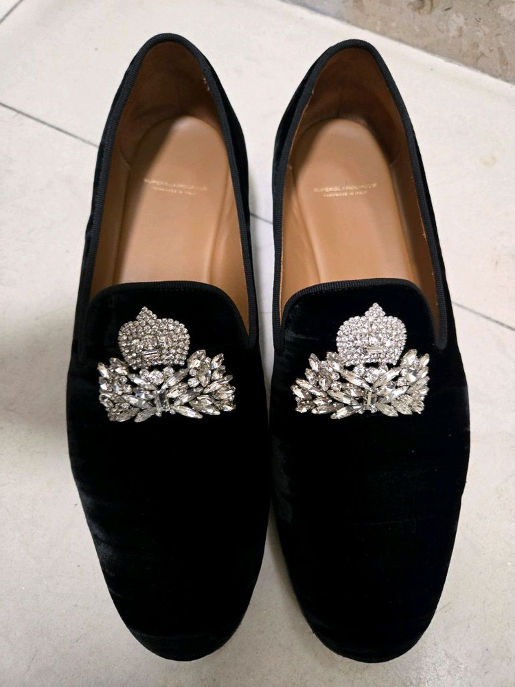 엘가노벰버 벨벳 소재의 블랙 슬립온 구두예요. 앞코에 크리스털 장식이 포인트로 되어있고, 밑창은 가죽 소재로 되어있어요. 전체적으로 깔끔한 상태입니다. 50만원정도에 구매했던기억이고 20에내놓습니다. 사이즈는 265정도신으시면 잘맞으실거에요.