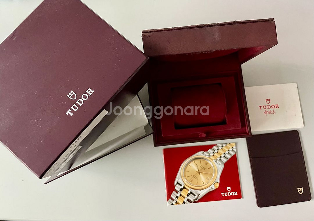 튜더 프린스 2005년식 시계없는 풀박스입니다 보증서도 있어요 사진속 구성입니다 다시 한번 말씀드리지만 시계없는 케이스만입니다. 케이스 한면 모서리가 사진처럼 약간의 사용감은 있으나 내부 깨끗하고 부식되서 벗겨지는 현상은 없습니다 택배거래 합니다 직거래도 서울 구로동 제가 있는 곳 오시면 가능해요.