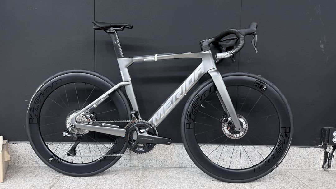 메리다 리엑토 로드바이크입니다. 실버 컬러의 깔끔한 디자인으로 상태 양호해 보여요. 고급 컴포넌트가 장착된 프리미엄 모델이에요. 새 제품입니다 구동계가 원래 세팅인 듀라에이스에서 울테리그라로 변경되었 세팅되었어요