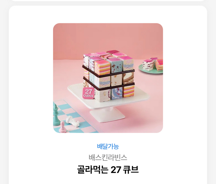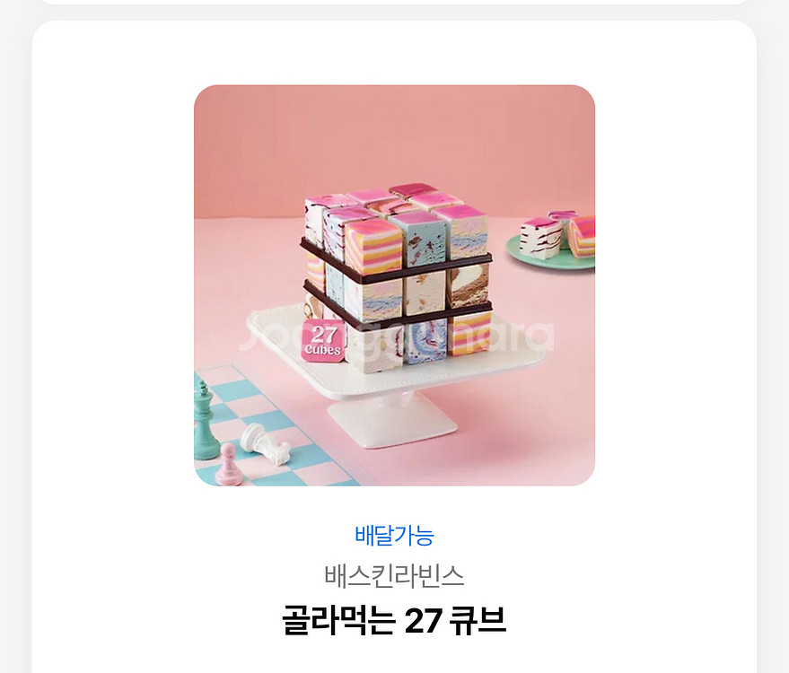 개인정보(거래정보)를 주고받는 행위는 사기에 노출될 수 있으므로 즉시 중고나라로 신고해 주세요배스킨라빈스의 인기 골라먹는 27큐브 쿠폰이에요! 27가지 맛을 골라서 먹을 수 있어서 정말 좋아요. 미사용 새 상품입니다.29000원인데 25000원에 팔아요 !